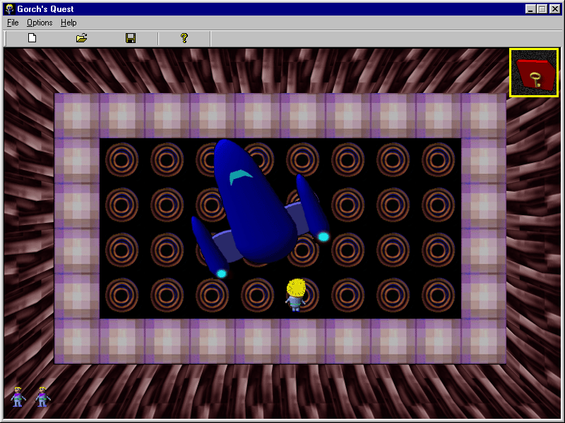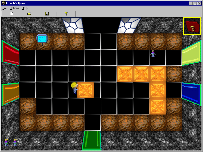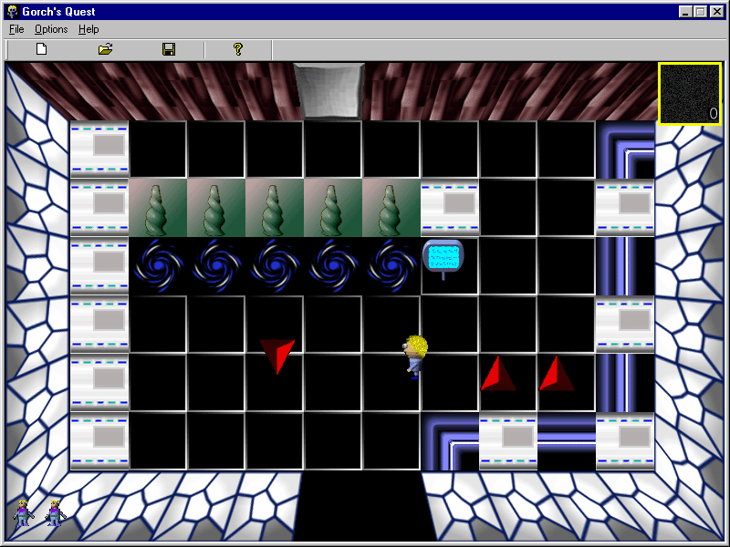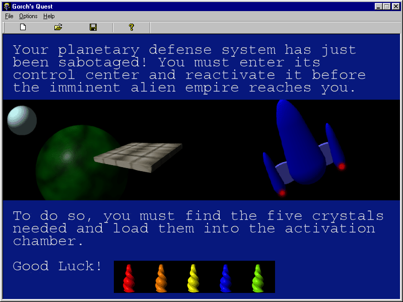 You are the young hero, Gorch, who must save his planet from the attack of an alien empire that indulges in galactic domination. To do so, you must navigate the catacombs of the Planetary Defense System that has been sabotaged. Find and return the five crystals to the main control room so that the defense system can be reactivated. Good Luck!