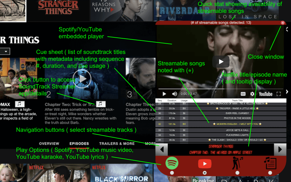 Soundtrack Streamer is a Chrome browser extension that lets you access the soundtrack data from a Netflix-owned title and directly stream its licensed songs using a variety of options: Spotify, Youtube ( music videos, karaoke, and lyrics ) Special Thanks to the Amadeus team ( including Neha Kapoor and Nick Osztreicher ) for providing the data source that made this hack possible! )
